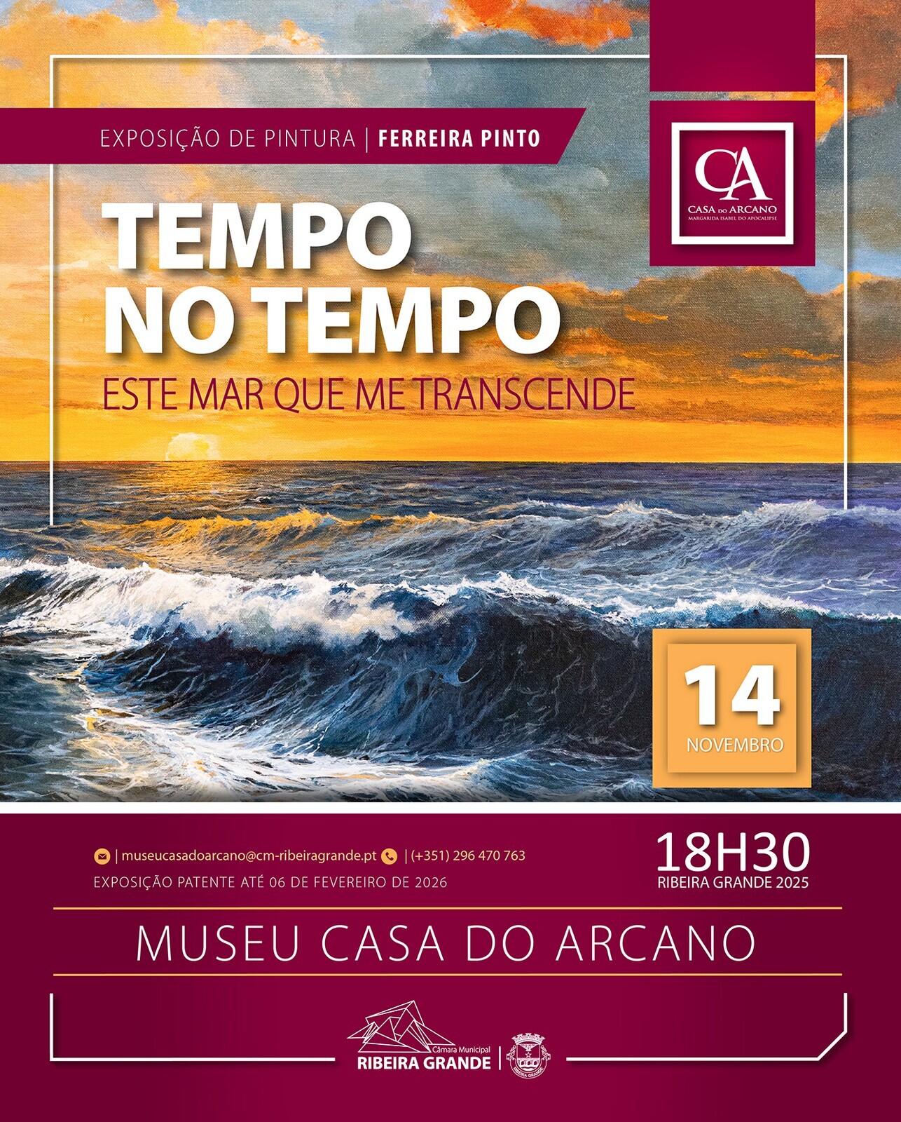 No próximo dia 14 de novembro, sexta-feira, pelas 18h30, irá decorrer a inauguração da exposição de pintura "Tempo no tempo: Este mar que me transcende", no Museu Casa do Arcano, do artista Ferreira Pinto.